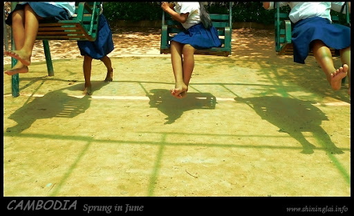 正午的阳光很热烈,我拉了拉帽沿,听着陈升的《塔里的男孩》,“白色的野菊花,是否有白色的梦..白色的海鸥,是否有白色的梦”。举目望去,他们都穿着白色的校服,有些推着自行车进来,有些人在操场玩类似垒球的游戏,有些在荡秋千,太阳跟着影子一上一下。陈升的故事在海边,我的故事则在柬埔寨。 柬埔寨的孩子,是为part 3.