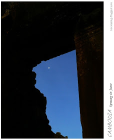 其实,在雨季的柬埔寨能正常见到日出已经是很幸运的了。在"Library",抬头仍能看到挂在天空的月亮。月神苏摩依旧眷恋大地,而另外一边太阳神苏里耶已经让吴哥披上金灿灿的阳光。